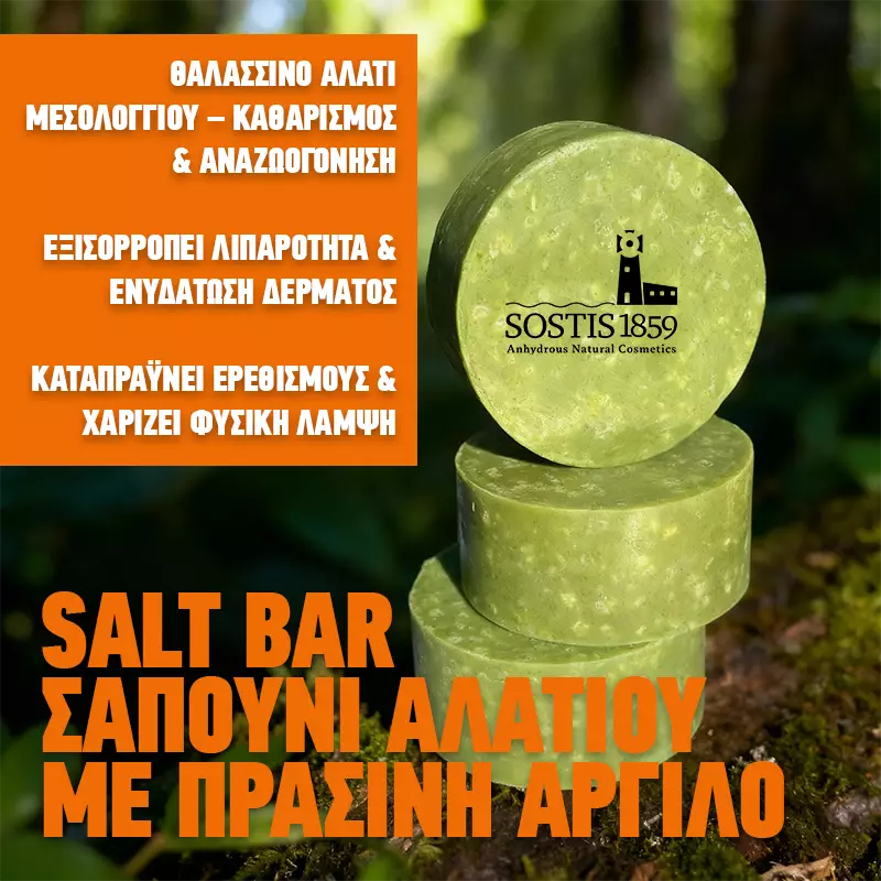 Σαπούνι πλούσιο σε φυσικό ακατέργαστο θαλασσινό αλάτι Μεσολογγίου, συνδυάζει τον καθαρισμό με την ήπια απολέπιση. Παρουσιάζει ήπια στυπτική, αντισηπτική και βακτηριοστατική  δράση κατά την εφαρμογή του, καθαρίζει και αναζωογονεί το θαμπό δέρμα. Λόγω της ισχυρής παρουσίας ασαπωνοποίητων ελαίων, φροντίζει την επιδερμίδα και αφήνει μια έντονη αίσθηση απαλότητας και φρεσκάδας.